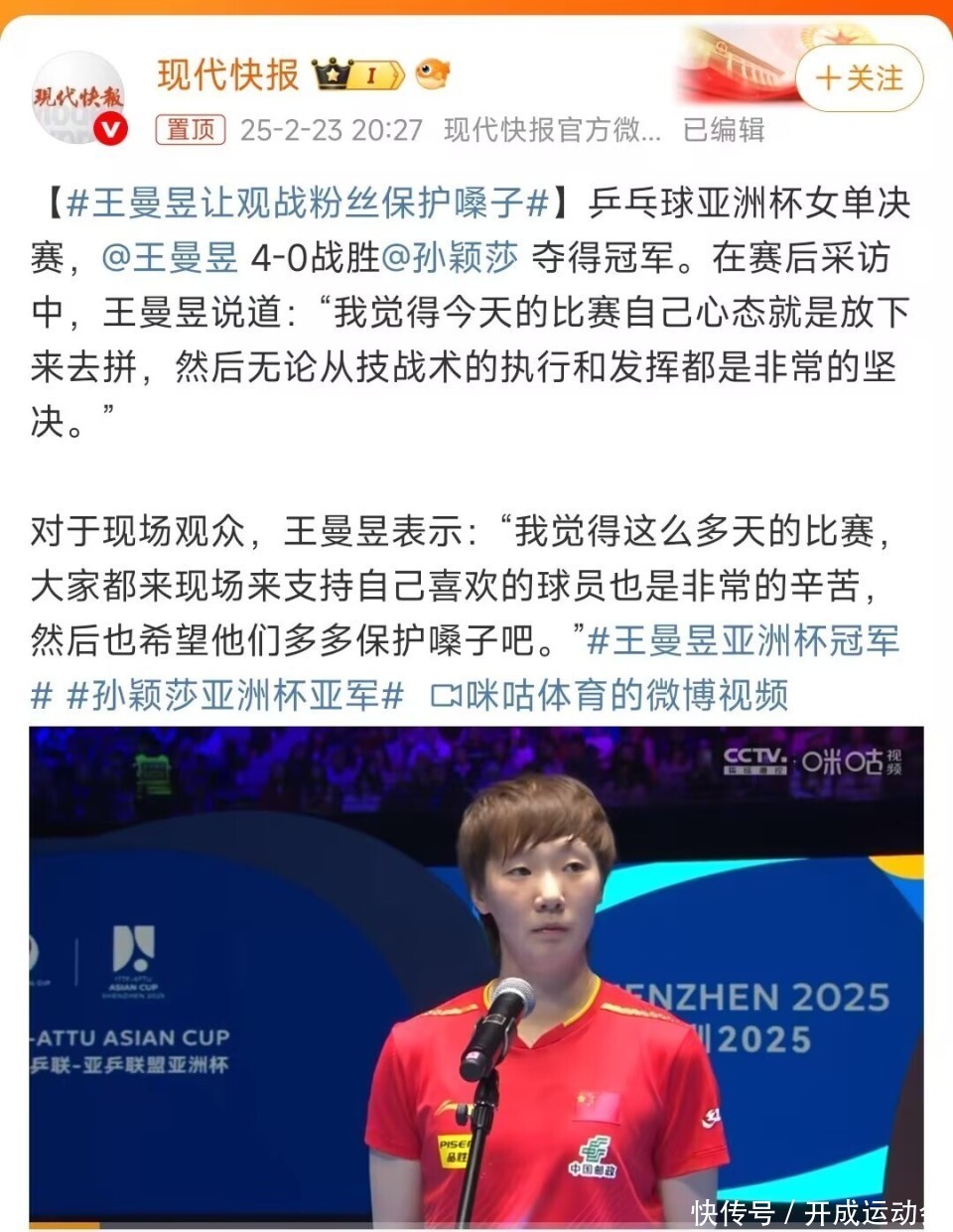 这样的“内涵”,让孙颖莎的铁杆粉丝非常不高兴,说王曼昱没有大将之风,没有正确对待买票观看比赛的球迷!
